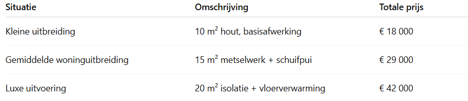 De exacte prijs verschilt per project en per aannemer.💡 Gemiddeld betaal je € 1 500 – € 2 500 per m² voor een complete uitbreiding.